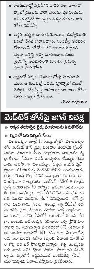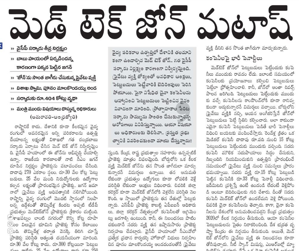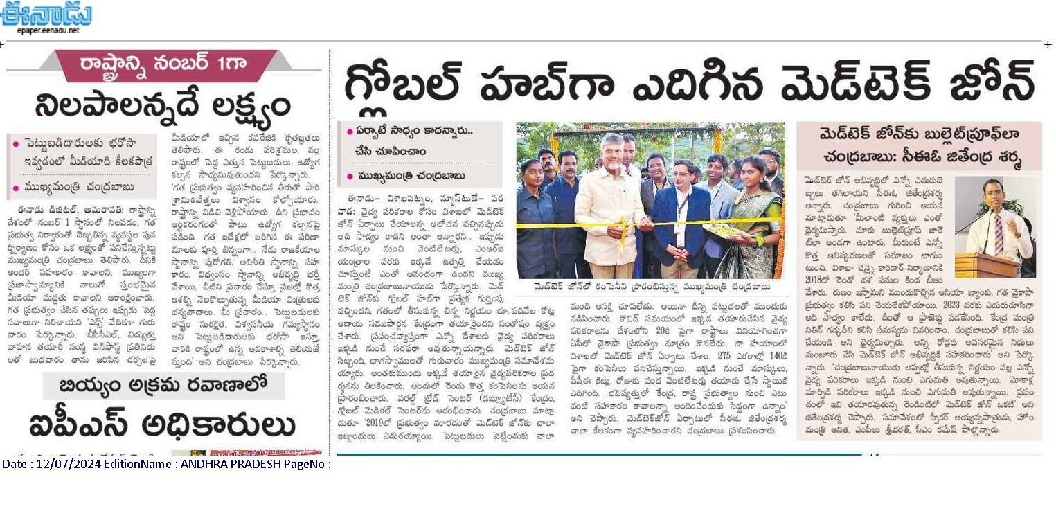 sonykongara Posted July 22, 2024 Author Posted July 22, 2024 MedTech Zone: మెడ్టెక్ జోన్ ‘విశ్వ’రూపం! వైకాపా ప్రభుత్వ హయాంలో మెడ్టెక్ జోన్ అభివృద్ధికి సరైన సహకారం లభించలేదు. సంస్థ సీఈవో జితేంద్రశర్మ కేంద్ర ప్రభుత్వ సహకారంతో ముందుకు సాగారు. చంద్రబాబు మళ్లీ ముఖ్యమంత్రి కావడంతో అందులో పెట్టుబడులు పెరగడంతోపాటు ఉపాధి అవకాశాలు మెరుగుపడతాయని స్థానికులు ఆశాభావం వ్యక్తం చేస్తున్నారు. Updated : 22 Jul 2024 07:22 IST విశాఖలో నెలకొల్పడం సీఎం చంద్రబాబు ముందుచూపునకు నిదర్శనం వైద్య పరికరాల తయారీలో అంతర్జాతీయ స్థాయికి ఎదిగిన ప్రస్థానం మెడ్టెక్ జోన్లో భవనాలు ఎనిమిదేళ్ల క్రితం.. కనుచూపు మేర అటవీ ప్రాంతం.. రవాణా సౌకర్యాలే కాదు.. సెల్ఫోన్ సిగ్నళ్లు కూడా రాని పరిస్థితి! ఇప్పుడు.. ఆ ప్రాంతం ఆవిష్కరణలకు కేంద్రమైంది. కొవిడ్ విపత్తు సమయంలో ఆపద్బాంధవిగా నిలిచింది. ముఖ్యమంత్రి చంద్రబాబు నాయుడి ముందుచూపు, అంకితభావానికి ప్రతీకగా నిలిచింది. ఆచరణ సాధ్యం కాదన్న ప్రాజెక్టు ‘గ్లోబల్ హబ్’గా ఎదిగింది. రూ. 10 వేల కోట్ల ఉత్పత్తులు అందించే స్థాయికి చేరింది. అదే విశాఖపట్నంలోని ఆంధ్రప్రదేశ్ మెడికల్ టెక్నాలజీ (మెడ్టెక్) జోన్. వైకాపా ప్రభుత్వ హయాంలో మెడ్టెక్ జోన్ అభివృద్ధికి సరైన సహకారం లభించలేదు. సంస్థ సీఈవో జితేంద్రశర్మ కేంద్ర ప్రభుత్వ సహకారంతో ముందుకు సాగారు. చంద్రబాబు మళ్లీ ముఖ్యమంత్రి కావడంతో అందులో పెట్టుబడులు పెరగడంతోపాటు ఉపాధి అవకాశాలు మెరుగుపడతాయని స్థానికులు ఆశాభావం వ్యక్తం చేస్తున్నారు. దానికి అనుగుణంగానే సీఎంగా బాధ్యతలు చేపట్టిన తరువాత మొదటిసారి ఉత్తరాంధ్ర పర్యటనలో మెడ్టెక్ జోన్ను సందర్శించి తన లక్ష్యాన్ని చంద్రబాబు స్పష్టం చేశారు. దీన్ని ప్రారంభించే సమయానికి దేశీయంగా 96 శాతం వైద్య పరికరాలు దిగుమతి చేసుకునేవారు. వాటి విలువ ఏడాదికి రూ. 65 వేల కోట్లు. ఈ విషయాన్ని అప్పట్లో కేంద్ర వైద్యారోగ్య శాఖలో పని చేస్తున్న జితేంద్రశర్మ గుర్తించారు. 2015లో ముఖ్యమంత్రిగా ఉన్న చంద్రబాబుకు ఆయన ఆరోగ్య సలహాదారు పనిచేశారు. వైద్య పరికరాల తయారీకి ఓ కేంద్రం కావాలని కేంద్ర, రాష్ట్ర ప్రభుత్వాలకు ప్రతిపాదించారు. అప్పట్లో ఎవరూ మద్దతు తెలపకపోయినా.. శర్మను చంద్రబాబు ప్రోత్సహించారు. మెడ్టెక్ జోన్ నెలకొల్పాలంటే శాస్త్రీయ ప్రయోగశాలలు అవసరం. అప్పటికి చైనా, అమెరికా, సింగపూర్లో మాత్రమే అవి ఉన్నాయి. వాటిని స్థానికంగా ఏర్పాటు చేస్తే పెట్టుబడులు రావడంతోపాటు ఒక ఎకో సిస్టమ్ తయారవుతుందని భావించారు. తయారు చేసిన పరికరాల ఎగుమతికి పోర్టు ఉన్న విశాఖ అనువైన ప్రాంతమని చంద్రబాబు చెప్పడంతో శర్మ అంగీకరించారు. తర్వాత రాష్ట్ర ప్రభుత్వం పెదగంట్యాడ మండలంలోని నడుపూరు గ్రామానికి సమీపంలో 275 ఎకరాలు కేటాయించింది. 2016లో మెడ్టెక్ జ