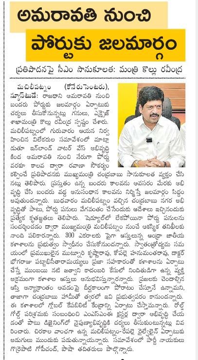 sonykongara Posted April 26, 2016 Posted April 26, 2016 (edited) బందరు పోర్టుకు భూమిని సమీకరించడానికి త్వరలోనే నోటిఫికేషన్ 15 మంది డిప్యూటీ కలెక్టర్ల నియామకం మచిలీపట్నం పోర్టుకు అవసరమైన 12 వేల ఎకరాల భూమిని సమీకరించడానికి త్వరలోనే నోటిఫికేషన జారీ చేయనున్నట్లు బీసీ సంక్షేమం, ఎక్సైజ్ శాఖల మంత్రి కొల్లు రవీంద్ర వెల్లడించారు. రెండు నెలల్లో భూ సమీకరణ పూర్తి చేసి నిర్మాణ పనులను వేగవంతం చేస్తామని సోమవారం హైదరాబాద్లో చెప్పారు. 15 మంది డిప్యూటీ కలెక్టర్లను దీని కోసం కేటాయించామని ఆయన తెలిపారు. మచిలిపట్నం పోర్టుకు అవసరమైన 12 వేల ఎకరాల భూమిని సేకరించడానికి త్వరలోనే నోటిఫికేషన జారీ చేయనున్నట్లు బీసీ సంక్షేమం, ఎక్సైజ్ శాఖల మంత్రి కొల్లు రవీంద్ర వెల్లడించారు. సోమవారం ఆయన విలేకర్లతో మాట్లాడుతూ, రెండు నెలల్లో భూసేకరణ పూర్తిచేసి నిర్మాణ పనులను వేగవంతం చేస్తామని చెప్పారు. 15 మంది డిప్యూటీ కలెక్టర్లను దీనికోసం కేటాయించామన్నారు. మచిలిపట్నం రేవును కంటైనర్ పోర్టుగా అభివృద్ధి చేయడానికి సవివర ప్రాజెక్టు నివేదిక (డీపీఆర్)ను తయారుచేసి ఇప్పటికే పోర్టు అథారిటీకి సమర్పించామన్నారు. ఆఽధునిక సాంకేతిక పరిజ్ఞానంతో నవ యుగ సంస్థ ఈ పోర్టు నిర్మాణ పనులను చేపడుతుందన్నారు. దుబాయ్లోని జభలాలీ పోర్టును పరిశీలించినట్లు తెలిపారు. ఈ సందర్భంగా అలీ అండ్ సన్స్ ఆఫ్ షోర్ మెరైన సాంకేతిక నిపుణుల బృందంతో సమావేశమై పలు అంశాలను చర్చించినట్లు తెలిపారు. పోర్టు నిర్మాణం, నౌకల తయారీ, మరమ్మతులు, జెట్టీల నిర్మాణం, షిప్ లిప్ట్లు, ఎగుమతులు, మెరైన సర్వీసులు తదితర అంశాలకు సంబంధించి వారి సహాయ సహకారాలను కోరామని చెప్పారు. త్వరలోనే వారు ఇక్కడకు వచ్చి మచిలీపట్నం పోర్టును సందర్శించనున్నారని మంత్రి వెల్లడించారు. Edited August 27, 2018 by sonykongara