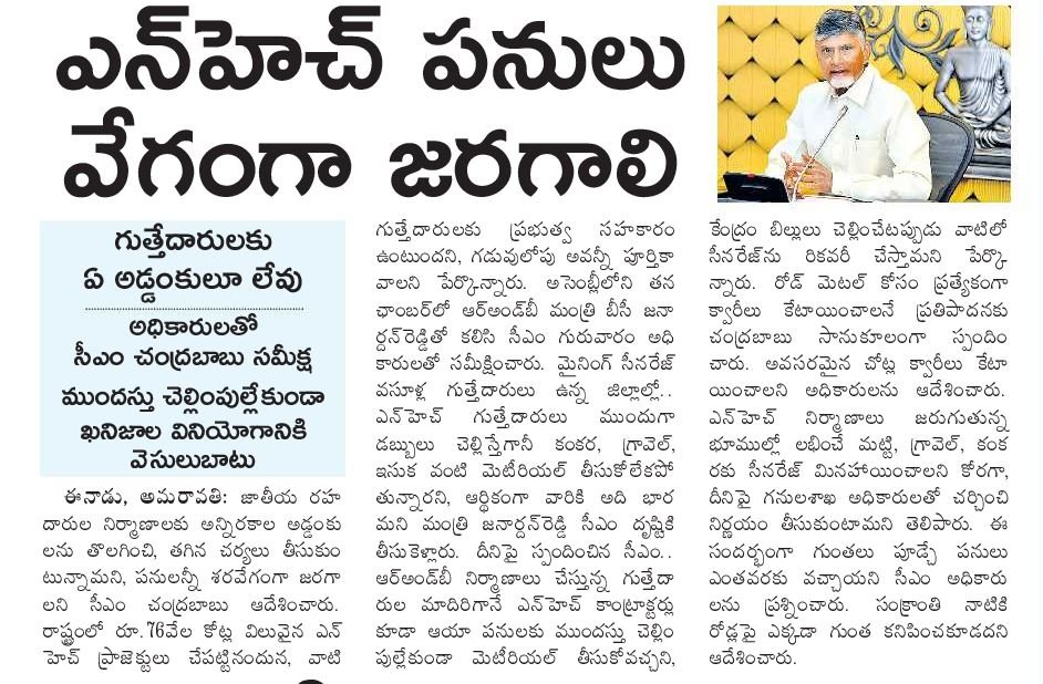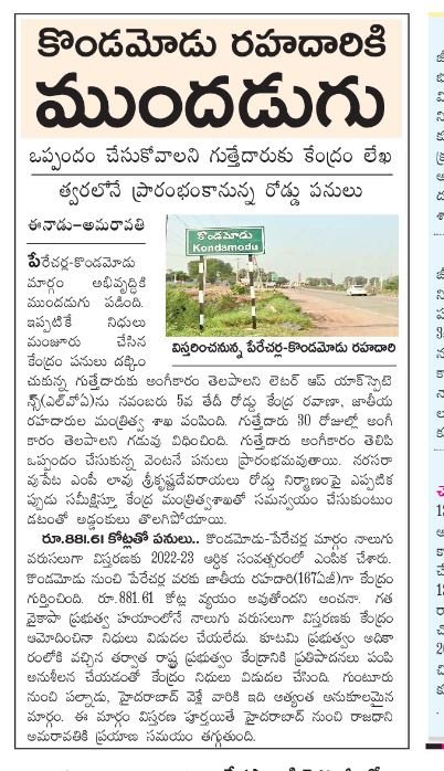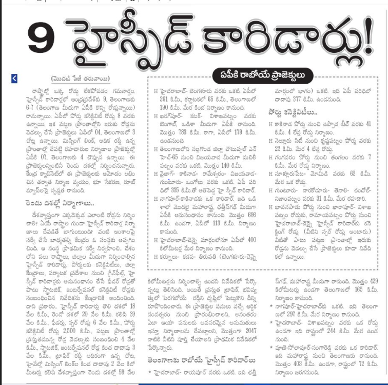 sonykongara Posted July 6, 2024 Author Posted July 6, 2024 Amaravati: అమరావతి ఓఆర్ఆర్కు పచ్చజెండా రాజధాని అమరావతిని రాష్ట్రంలోని ఇతర ప్రాంతాలు, ఇతర రాష్ట్రాలతో అనుసంధానించే పలు రహదారుల ప్రాజెక్టులకు కేంద్ర ప్రభుత్వం ప్రాథమికంగా ఆమోదం తెలిపింది. Updated : 06 Jul 2024 09:49 IST రూ.20-25 వేల కోట్లు భరించేందుకు కేంద్రం సిద్ధం పలు కీలక ప్రాజెక్టులకూ ఆమోదం అమరావతి - హైదరాబాద్ మధ్య ఆరు వరసల గ్రీన్ఫీల్డ్ ఎక్స్ప్రెస్ వే 60-70 కి.మీ. మేర తగ్గనున్న దూరం ముప్పవరం-అమరావతి మధ్య 90 కి.మీ. రహదారికి ప్రతిపాదన రాయలసీమ నుంచి రాజధానికి పెరగనున్న అనుసంధానం ఈనాడు - అమరావతి రాజధాని అమరావతిని రాష్ట్రంలోని ఇతర ప్రాంతాలు, ఇతర రాష్ట్రాలతో అనుసంధానించే పలు రహదారుల ప్రాజెక్టులకు కేంద్ర ప్రభుత్వం ప్రాథమికంగా ఆమోదం తెలిపింది. వాటిలో 189 కి.మీ. పొడవైన అమరావతి అవుటర్ రింగ్రోడ్డు (ఓఆర్ఆర్) సహా కీలక ప్రాజెక్టులున్నాయి. అవన్నీ 2014-19 మధ్య తెదేపా ప్రభుత్వం చేపట్టి, కొంత ముందుకు తీసుకెళ్లాక అధికారంలోకి వచ్చిన జగన్ ప్రభుత్వం అటకెక్కించిన, ఖూనీ చేసిన ప్రాజెక్టులు, విభజన చట్టంలో ఉన్న ప్రాజెక్టులే. ముఖ్యమంత్రి చంద్రబాబు వాటన్నిటినీ మళ్లీ కేంద్రం ముందుంచి.. ప్రాథమిక ఆమోదం లభించేలా చేశారు. కేంద్ర ఉపరితల రవాణా, జాతీయ రహదారుల మంత్రిత్వ శాఖకు చెందిన స్టాండింగ్ ఫైనాన్షియల్ కమిటీతో పాటు, ప్రధానమంత్రి కార్యాలయం ఆమోదం పొందాక అవన్నీ ఆచరణలోకి వస్తాయి. ఇప్పుడు ప్రాథమిక ఆమోదం పొందినవన్నీ గ్రీన్ఫీల్డ్ హైవేలు, ఎక్స్ప్రెస్వేలే..! ఆ ప్రాజెక్టులు సాకారమైతే అమరావతికి మిగతా ప్రాంతాలతో చాలా సులువైన, మెరుగైన కనెక్టివిటీ ఏర్పాటవుతుంది. చంద్రబాబు ముఖ్యమంత్రిగా బాధ్యతలు చేపట్టాక తొలి దిల్లీ పర్యటనలోనే... కేంద్ర ఉపరితల రవాణా, జాతీయ రహదారులశాఖ మంత్రి నితిన్ గడ్కరీతో గురువారం జరిపిన భేటీలో వాటికి ప్రాథమిక ఆమోదం లభించింది. అమరావతి ఓఆర్ఆర్ ప్రాజెక్టుకు భూసేకరణ సహా మొత్తం రూ.20-25 వేల కోట్లకుపైగా నిర్మాణ వ్యయాన్ని భరించేందుకు కేంద్రం ముందుకు వచ్చింది. విజయవాడ తూర్పు బైపాస్ రోడ్డు ప్రతిపాదనకు ఆమోదం తెలిపింది. అమరావతి, హైదరాబాద్ మధ్య మెరుగైన అనుసంధానం కోసం ఇప్పుడున్న జాతీయ రహదారికి ప్రత్యామ్నాయంగా.. 60-70 కి.మీ. దూరం తగ్గేలా ఆరు వరుసల గ్రీన్ఫీల్డ్ ఎక్స్ప్రెస్వే నిర్మాణానికి కేంద్రం ప్రాథమికంగా సమ్మతించింది. శ్రీసత్యసాయి జిల్లాలోని కొడికొండ నుంచి మేదరమెట్ల వరకు తలపెట్టిన ఎక్స్ప్రెస్వేని అమరావతితో అనుసంధానిస్తూ... మేదరమెట్ల-అమరావతి మధ్య 90 కి.మీ. పొడవైన గ్రీన్ఫీల్డ్ హైవేని నిర్మించాలన్న ప్రతిపాదనపై సానుకూలంగా స్పందించింది. ఓఆర్ఆర్ సహా ఈ రహదారుల నిర్మాణం మొదలైతే... రెండు మూడు సంవత్సరాల్లోనే సమూల మార్పులు వస్తాయి. రాజధాని అమరావతితో పా