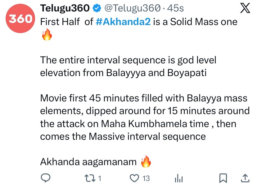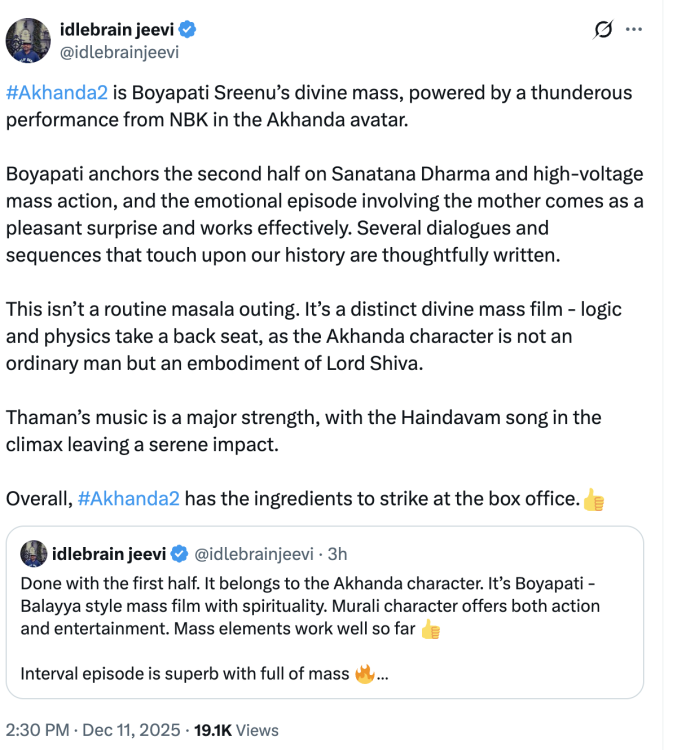 ramntr Posted February 8 Posted February 8 On 2/7/2025 at 4:51 PM, Nandamurian said: This is why I feel bad .. Akhanda Hindi lo full ga release cheysi unntey KGF lekka aaadeydhi we missed that golden chance Sr heroes ki young batch ki vachentha vupu vundadu uncle, age కూడా chusukondi... Siru poyadu syera antu, adi kooda best production house nunchi released, but outrightly rejected... Akhanda will do better but don't expect Kgf kinda performance...
